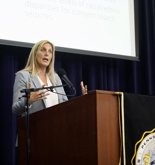 Glenn College senior research scientist Robin Engel announces the results of the data analysis at a Pennsylvania State Police press conference. (Credit: Pennsylvania State Police)
