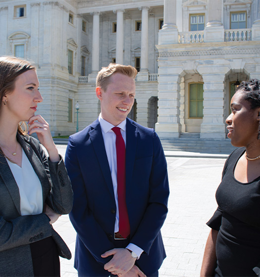 Glenn College 2022 MPA-DC graduates (from left) Haley Foster, Spencer Love, and Irene Lewis engage in a discussion outside the U.S. Capitol Building. (Credit: Majesti Brown)